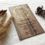 Invitaţie superbă din lemn de nuc pe care este redată o monogramă aurie cu iniţialele cuplului şi o coroniţă din flori şi frunze. Unicitate fiecărei invitaţii gravate pe lemn natural de nuc denotă aprecierea voastră faţă de diversitate şi eleganţă.
